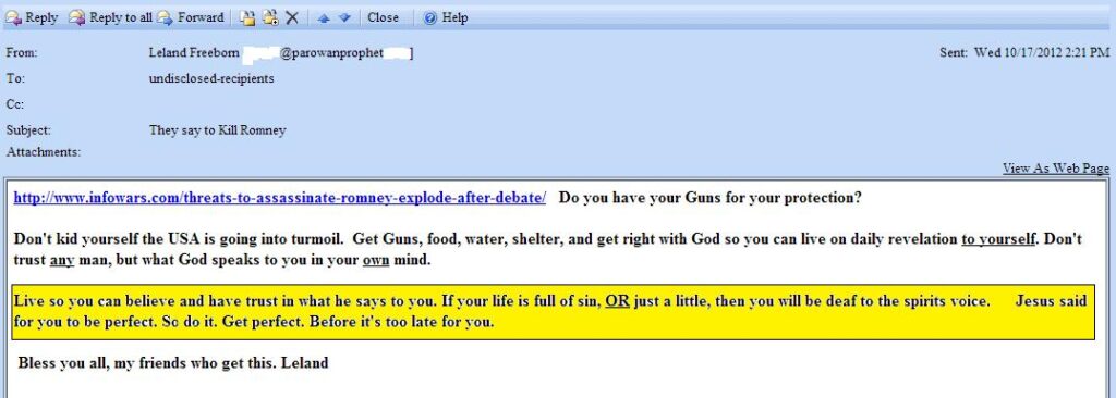 I got this email from Leland, the Parowan Prophet. While the first part is absolutely crazy…what with the whole “Shooting Mitt Romney” thing.